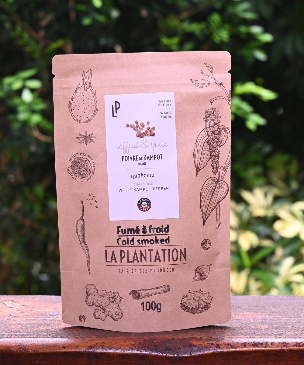 La Plantation propose une version fumée du Poivre blanc de Kampot, réalisée selon une méthode ancestrale de fumage à froid, propre à la tradition cambodgienne. Cette technique naturelle repose sur l’utilisation d’écorces de riz et de copeaux de noix de coco, apportant une signature aromatique gourmande.
